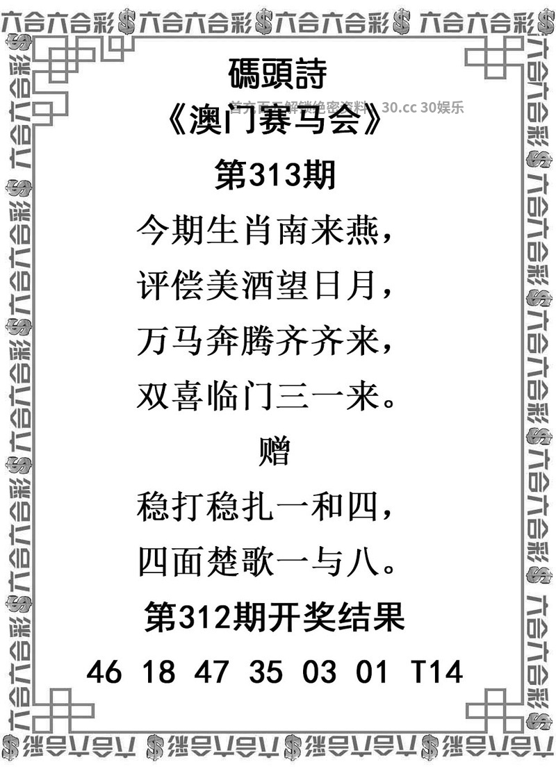 解:今期生肖南来燕,评偿美酒望日月,万马奔腾齐齐来,双喜临门三一来。